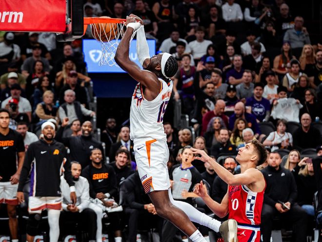 本场比赛前,快船宣布小卡继续休战,哈登因为个人原因缺席比赛!什么原因没说,但是时候检验一下这支快船真正的成色了。太阳这边开赛以来3胜5负,布克场均30+是常态,但无法带动队友,球队角色球员打开手感,能赢马刺;但也能输爵士、灰熊这样西部后几位的球队,起伏很大。不过本场比赛风雪哥杰伦格林终于等来了复出,迎来自己太阳生涯首秀!从两队首发就能看出最终的结局,太阳:杰伦格林+布克+阿伦+奥尼尔+马威;快船这边:比尔+邓恩+巴图姆+德里克琼斯+祖巴茨。
