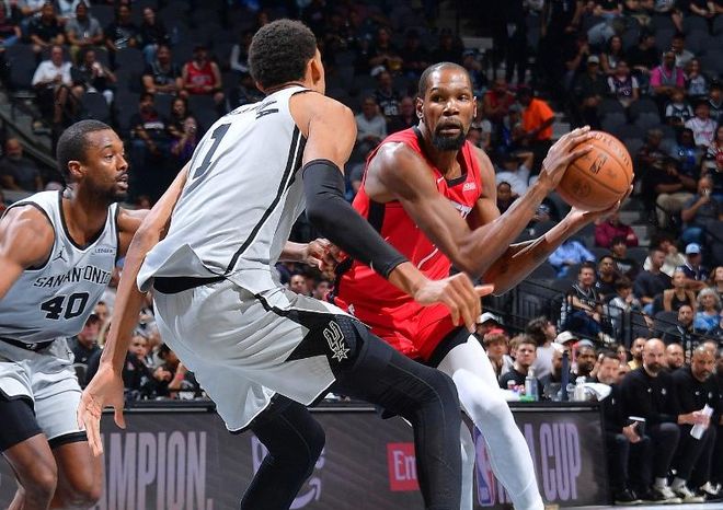 NBA杯小组赛继续进行,西部迎来一场焦点之战,休斯顿火箭客场挑战圣安东尼奥马刺。两队有一个共同点,那就是都有一位身高臂长的历史级天赋怪:航天城在休赛期找来了历史级得分手凯文-杜兰特,进攻效率直接来到了联盟第一;而文班亚马在休赛期历经少林寺的修炼洗礼已有了“高僧”之称,实力也是又有了质的飞跃。而在这场天赋对决中,两人也是自然而然成为了焦点,文班有着面对补防而来的阿杜上演隔扣的劲爆场面,KD不甘示弱地在过掉文班后,上演双手暴扣。两人场面上打得有来有回,历经四节鏖战,更高大也更年轻的文班亚马笑到了最后,交出22分8篮板4助攻2盖帽的成绩单,率队大胜火箭11分,拿下这场珍贵的胜利。